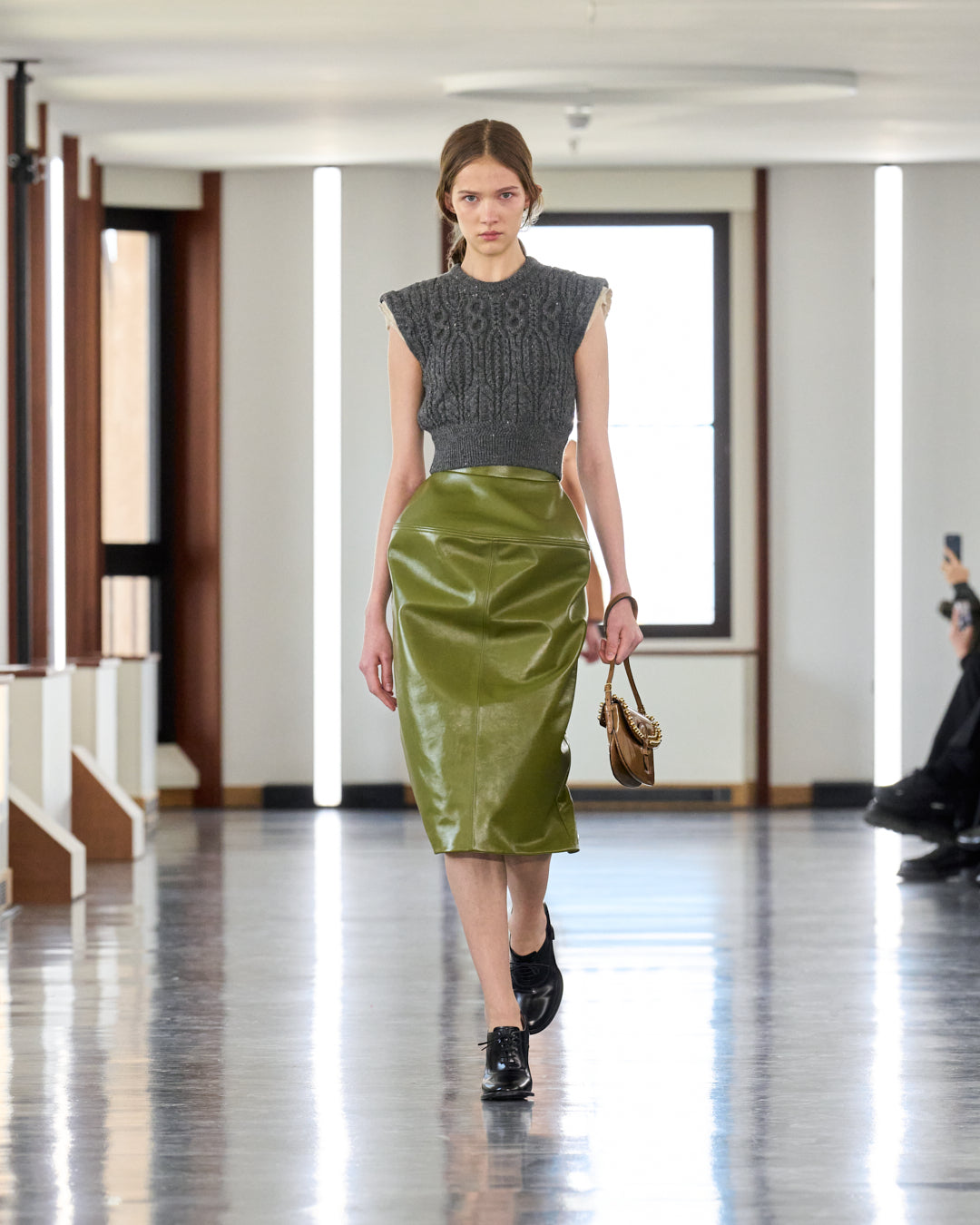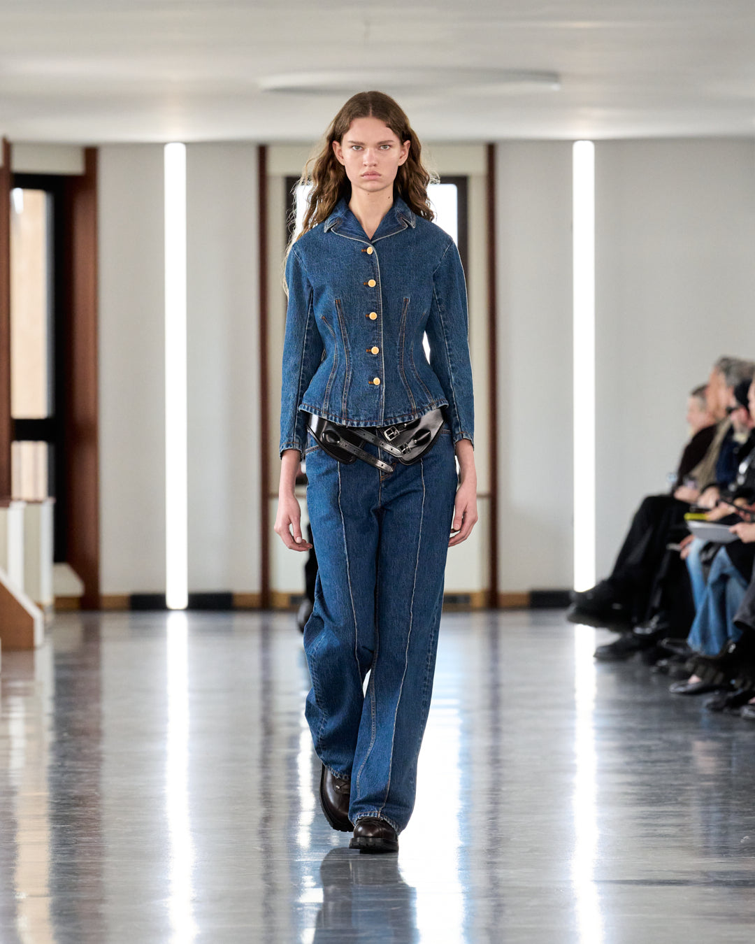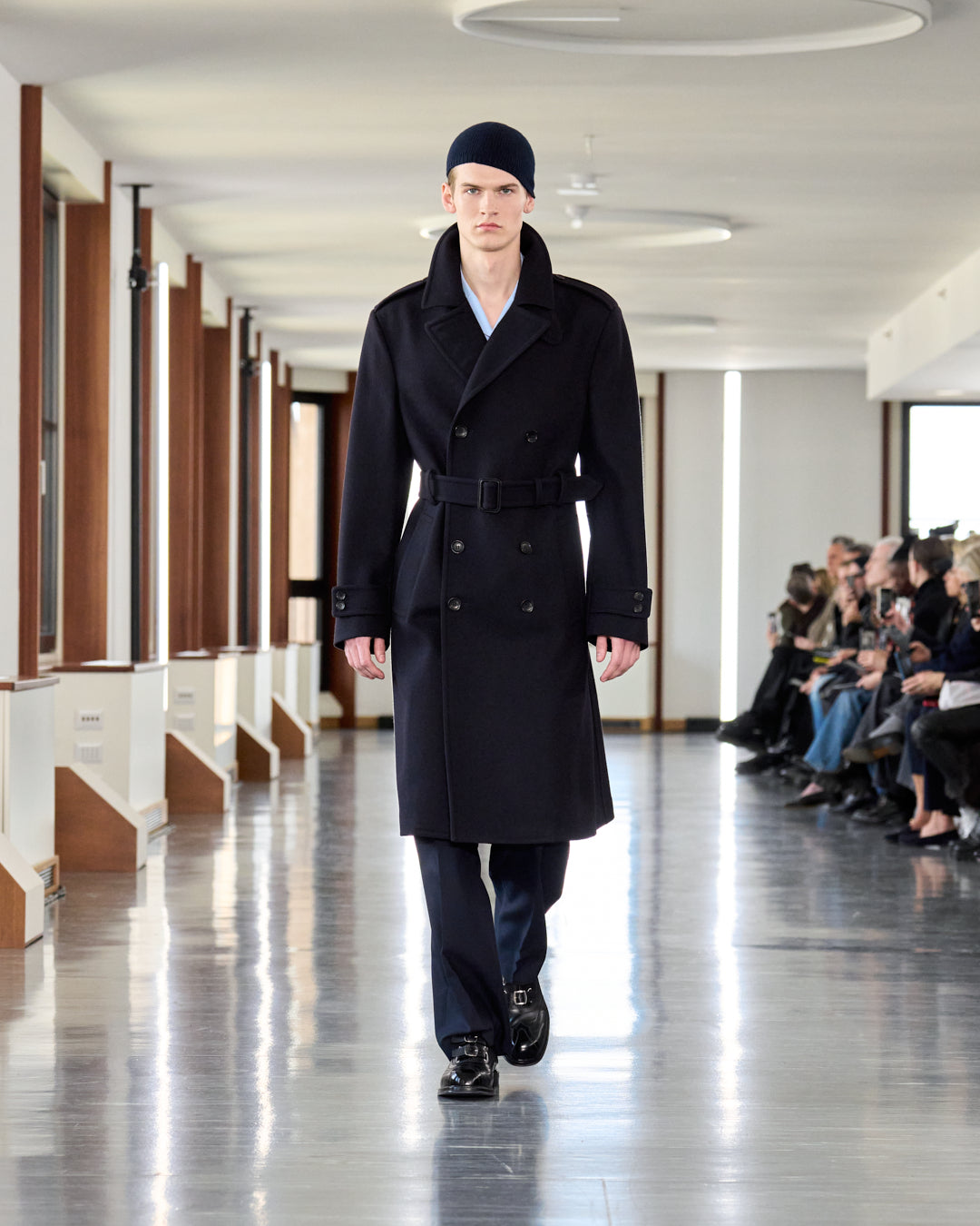 Set amidst the iconic heights of Torre Velasca in Milan, the Fall/Winter 2025 fashion show offered continuing themes of Swiss precision and formality, disrupted by wild elements such as texture and materiality, resulting in a striking contrast.